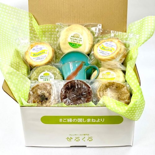 天然酵母のベーグルで作ったフレンチトースト『ベーグルdeフレンチトースト』6切、『メロンパンnaフレンチトースト プレーン』1個、プチサイズフレンチトーストの『プレーン』『カスタード』『チーズ』各1枚、アレンジが楽しい『か・さ・ね・て』2枚が入ります。